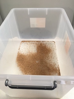 I find the easiest way to unpack and keep the crickets long term is put them straight into a plastic storage tub. You can buy these from most hardware and department stores. A good size is around 50 litres. Put some substrate in the bottom to help absorb moisture and/or provide extra food. I use chicken crumble, but you could also use kitty litter or vermiculite.