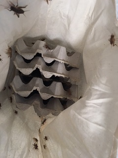 Inside the calico bag are the crickets with egg crate for protection during transit.